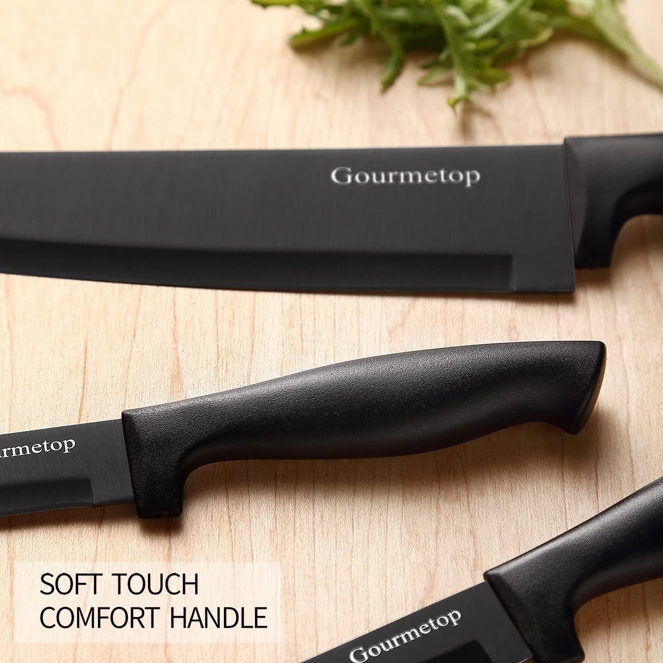BLACK TITANIUM BLADE & COMFORTABLE HANDLES: The stainless steel blades feature a natural black titanium plating. enhancing non-stick properties. robustness. and corrosion resistance. In contrast to solid PP plastic handles. our kitchen knife handles are coated with a soft-touch latex material. providing a comfortable. anti-slip grip for effortless use.