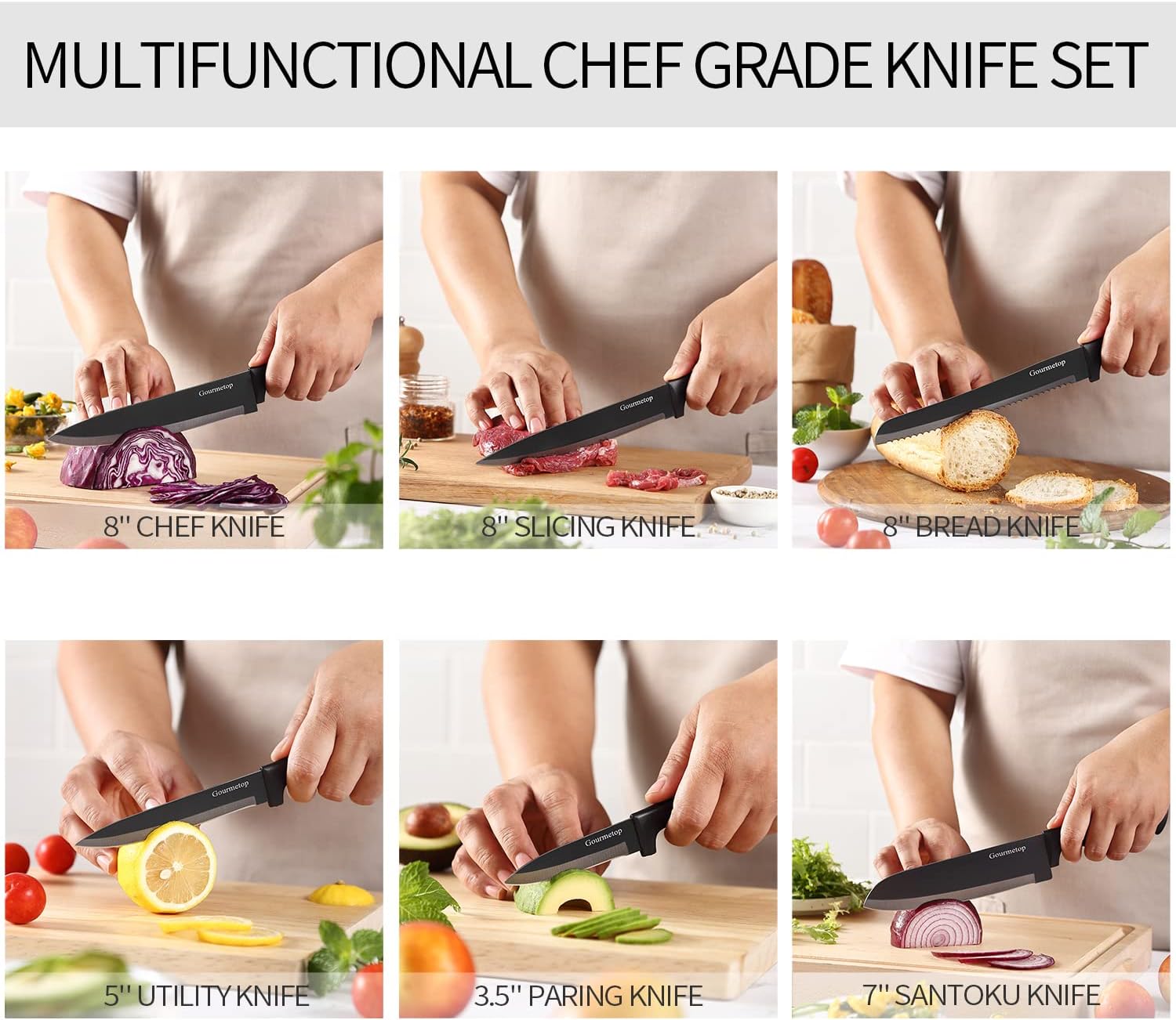 VERSATILE KNIFE COLLECTION: The multipurpose chef knife set includes an 8-inch Chef Knife. 8-inch Slicing Knife. 8-inch Bread Knife. 7-inch Santoku Knife. 5-inch Utility Knife. and 3.5-inch Paring Knife. Whether you're chopping vegetables. carving a turkey. cutting bread. or dicing fruits and meat. this comprehensive set is designed to help you achieve your culinary goals effortlessly.