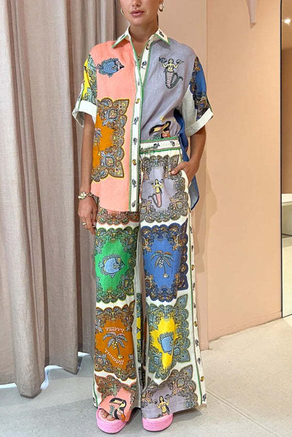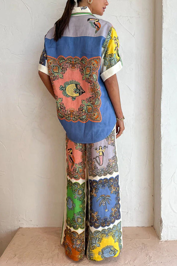 Pretty and Posh Linen Blend Mermaid Print Button Down Oversized Blouse
